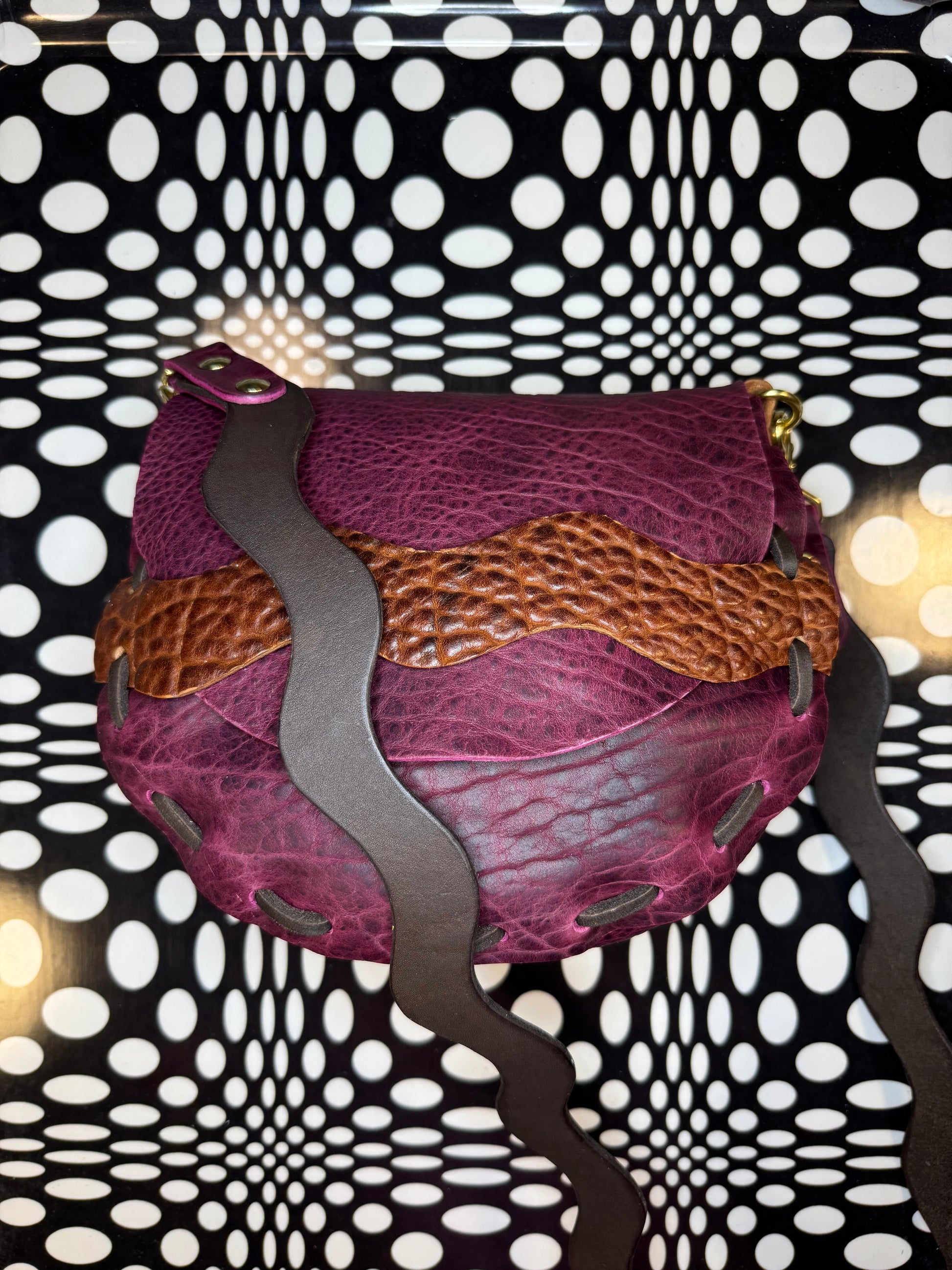 Laced leather saddle bag! One of a kind shoulder purse with wavy squiggly strap! Hand made, hand painted, shrunken bison or veg tan leather